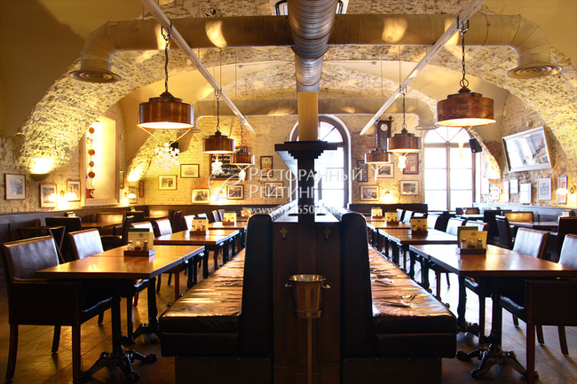 Место, выбранное для ресторана, одновременно элегантно и демократично. Использование в оформлении интерьеров натуральных материалов – дерева, кожи – создает в залах атмосферу теплоты и гостеприимства. Стены украшают фотографии, на которых изображены сцены повседневной жизни в дореволюционной России. Найденные в процессе ремонта помещения лошадиные подковы и гвозди, теперь заботливо вставлены в рамки, а вделанные в стены кольца, за которые в былые времена привязывали лошадей, напоминают посетителям ресторана об историческом прошлом здания.